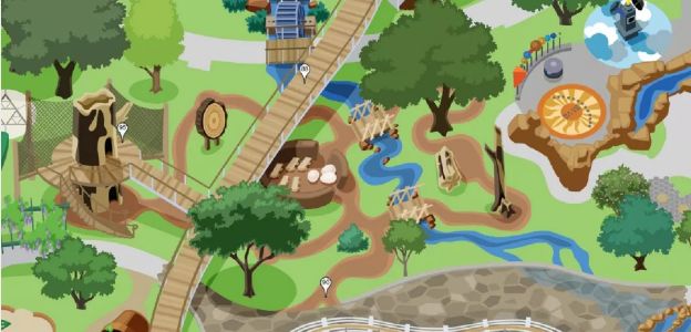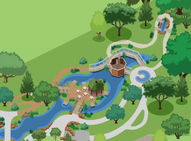 栖息休息区,一条9米多高的空中步道穿梭其间连接起整个区域。孩子们将在这里感受人与人、人与动物以及人与植物之间的关系。